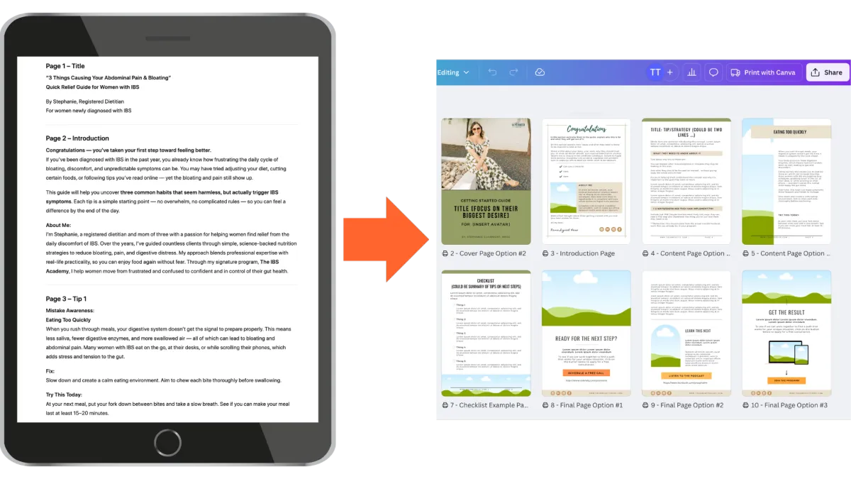 Take the content that the AI generates and paste it into the pre-designed Lead Magnet Canva template. Everything's laid out page by page so it's easy to know exactly where all the content goes.